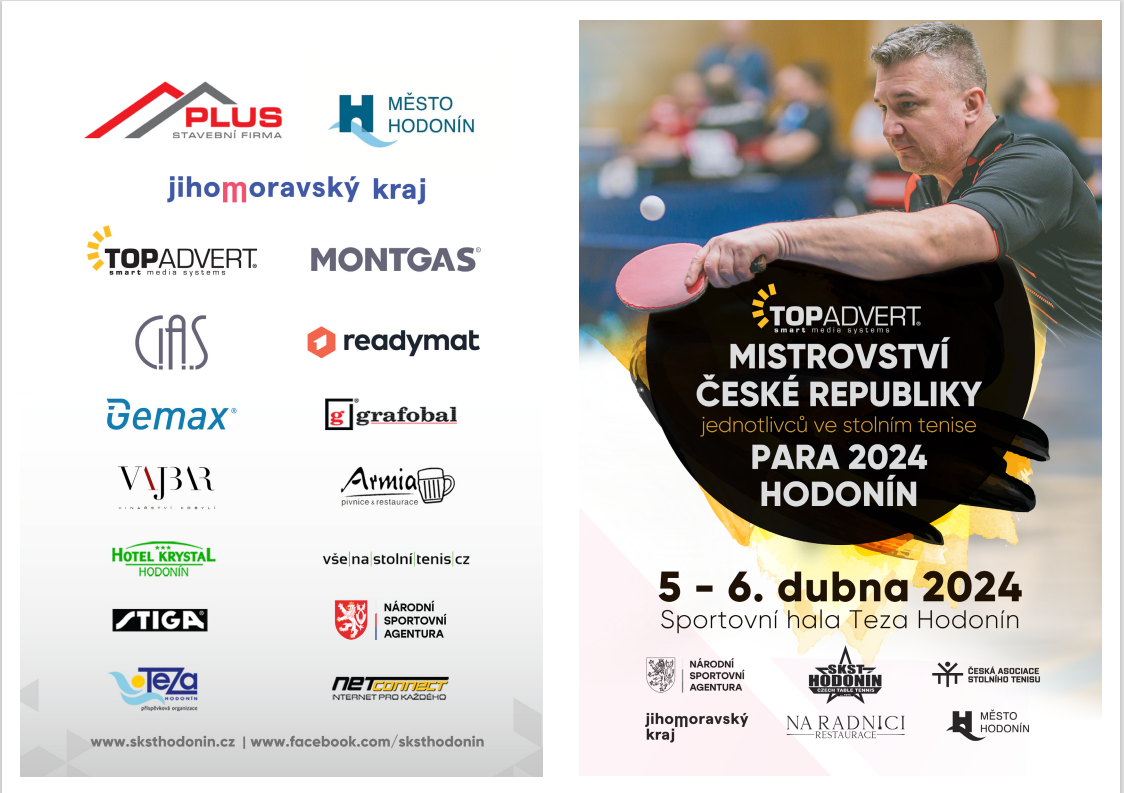 Mistrovství České republiky ve stolním tenise jednotlivců PARA 2024Pátek - Sobota 5. - 6. 4. 2024 od 9.00 hod.